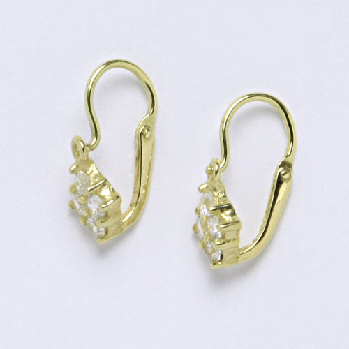 Dětské náušnice žluté zlato s bílým kamínkem, čtverečky. Celková velikost náušnice je 15 mm. Orientační váha náušnic je 1,24 g.