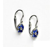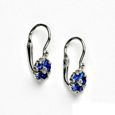 Dětské náušnice z bílého zlata mají tvar kytičky a jsou zdobeny zirkony v barvě spinelu. Materiál je zlato 585/1000. Průměr kytičky je 6 mm. Náušnice mají dětské zapínání. Celková výška náušnice je 15 mm.