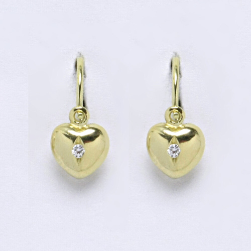 Dětské náušnice žluté zlato s bílým kamínkem, srdíčka. Celková velikost náušnice je 14 mm. Orientační váha náušnic je 1,13 g.
