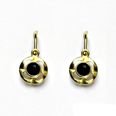 Dětské náušnice jsou vyrobeny ze žlutého zlata a jsou zdobeny přírodním granátem. Materiál je zlato 585/1000. Náušnice mají zapínání na brizuru. Celková výška náušnice je 15 mm a rozměr zdobné části je 7,5x7,5 mm.