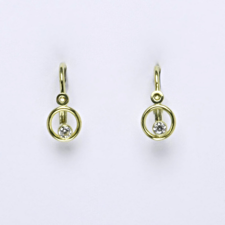 Dětské náušnice ze žlutého zlata s čirým zirkonem. Výška náušnice je 12 mm. Orientační váha náušnic je 0,79 g.
