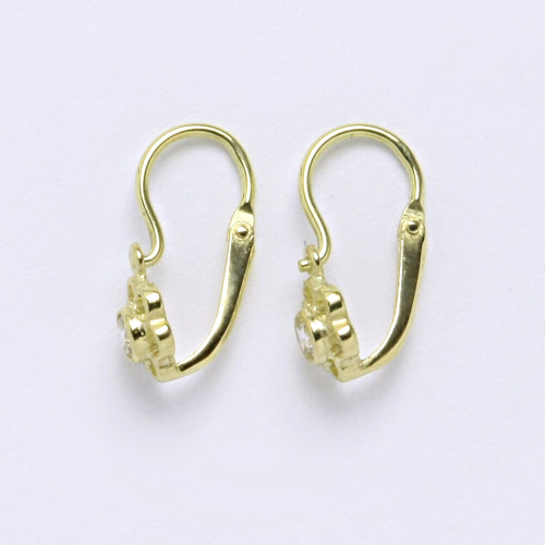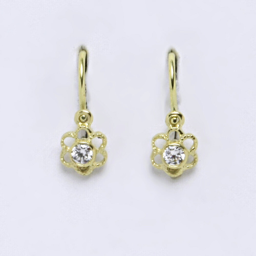 Dětské náušnice žluté zlato s bílým kamínkem, kytičky. Celková velikost náušnice je 14 mm. Orientační váha náušnic je 0,92 g.Hmotnost drahého kovu u tohoto zboží je nižší než 0,5 g za 1 kus ( 1 gram u 1 páru ), a proto je opuncováno rizostní značkou nebo popřípadě značkou výrobce.