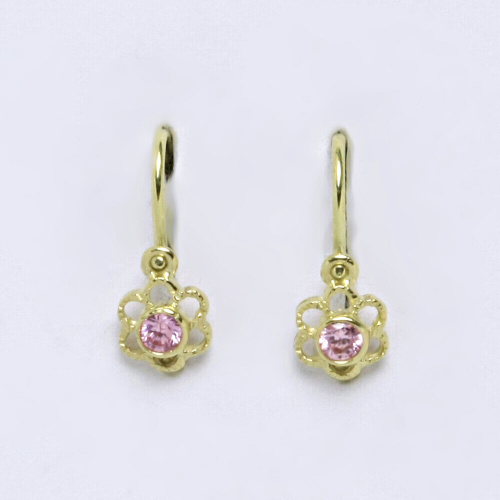 Dětské náušnice žluté zlato s růžovým kamínkem, kytičky. Celková velikost náušnice je 14 mm. Orientační váha náušnic je 0,93 g.Hmotnost drahého kovu u tohoto zboží je nižší než 0,5 g za 1 kus ( 1 gram u 1 páru ), a proto je opuncováno rizostní značkou nebo popřípadě značkou výrobce.
