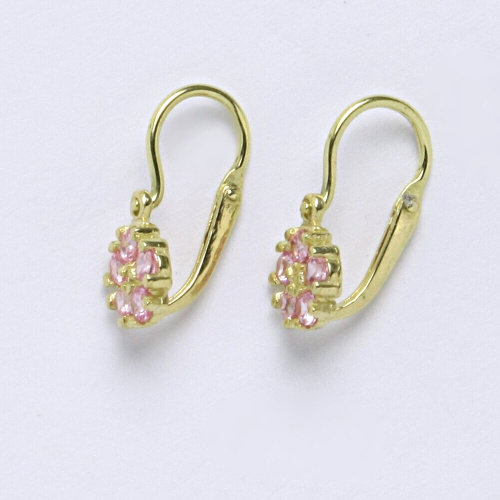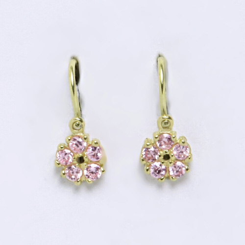 Dětské náušnice žluté zlato s růžovým kamínkem, kytičky. Celková velikost náušnice je 14 mm. Orientační váha náušnic je 1,14 g.