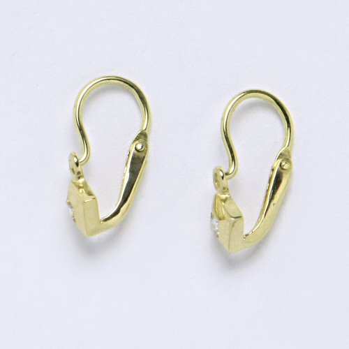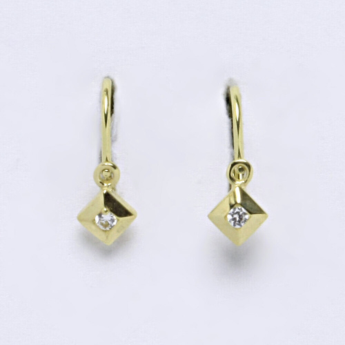 Dětské náušnice žluté zlato s bílým kamínkem, čtverečky. Celková velikost náušnice je 14 mm. Orientační váha náušnic je 0,82 g.Hmotnost drahého kovu u tohoto zboží je nižší než 0,5 g za 1 kus ( 1 gram u 1 páru ), a proto je opuncováno rizostní značkou nebo popřípadě značkou výrobce.
