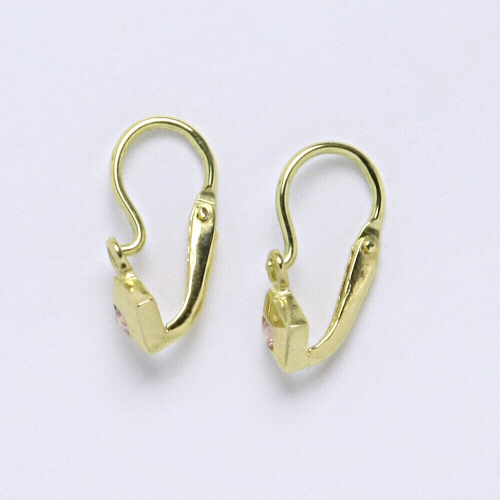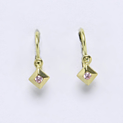 Dětské náušnice žluté zlato s růžovým kamínkem, čtverečky. Celková velikost náušnice je 14 mm. Orientační váha náušnic je 0,82 g.Hmotnost drahého kovu u tohoto zboží je nižší než 0,5 g za 1 kus ( 1 gram u 1 páru ), a proto je opuncováno rizostní značkou nebo popřípadě značkou výrobce.