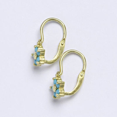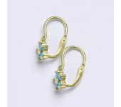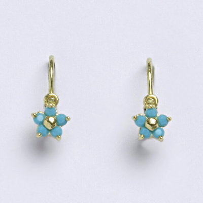 Dětské náušnice ze žlutého zlata se Swarovski krystalem tyrguise. Celková výška náušnice je 13 mm. Materiál je zlato 585/1000.Orientační váha páru dětských náušnic je 1,03 g.