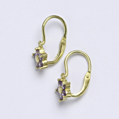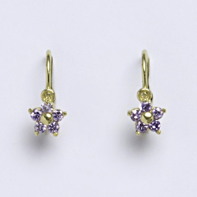 Dětské náušnice ze žlutého zlata se syntetickými ametysty. Celková výška náušnice je 13 mm. Materiál je zlato 585/1000.Orientační váha páru dětských náušnic je 1,03 g.