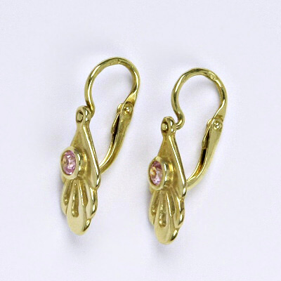 Náušnice jsou vyrobeny ze žlutého zlata 14 karátů 585/1000, jsou zdobeny syntetickým růžovým zirkonem. Zapínání na náušnicích je klasické dětské zapínání. Celková velikost náušničky je 18 mm.