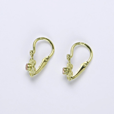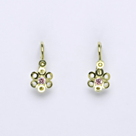 Dětské náušnice ze žlutého zlata ve tvaru kytičky s růžovým zirkonem. Výška náušnice je 13 mm. Orientační váha náušnic je 0,82 g.