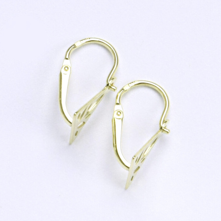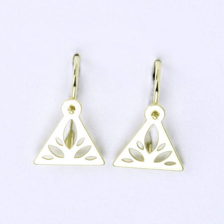 Dětské náušnice žluté zlato 14 karátů, trojúhelníčky. Celková velikost náušnice je 16 mm. Orientační váha 0,89 g.Hmotnost drahého kovu u tohoto zboží je nižší než 0,5 g za 1 kus ( 1 gram u 1 páru ), a proto je opuncováno rizostní značkou nebo popřípadě značkou výrobce.