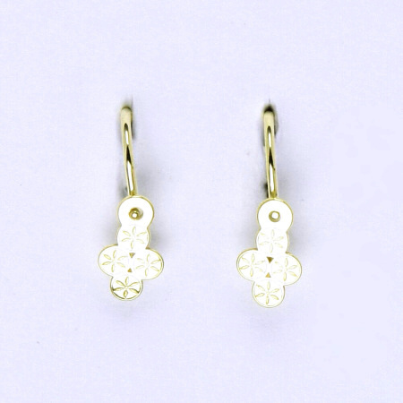 Dětské náušnice žluté zlato 14 karátů, kytičky. Celková velikost náušnice je 16 mm. Orientační váha 0,74 g .Hmotnost drahého kovu u tohoto zboží je nižší než 0,5 g za 1 kus ( 1 gram u 1 páru ), a proto je opuncováno rizostní značkou nebo popřípadě značkou výrobce.