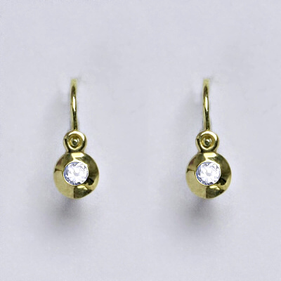 Zlaté dětské náušničky se syntetickým zirkonem na klasické zapínání. Průměr syntetického zirkonu je 2 mm. Výška náušnice je 13 mm. Orientační váha náušnic je 0,74 g. Materiál je žluté zlato 14 karátů 585/1000.