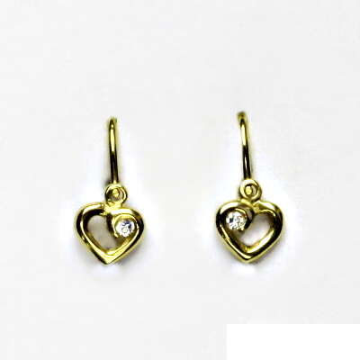 Dětské náušnice mají tvar srdíčka a jsou zdobeny čirým zirkonem. Náušnice jsou vyrobeny ze žlutého zlata. Materiál náušnic je zlato 585/1000. Celková výška náušnice je 14 mm. Rozměr zdobné části je 5x6 mm. Náušnice mají dětské zapínání.