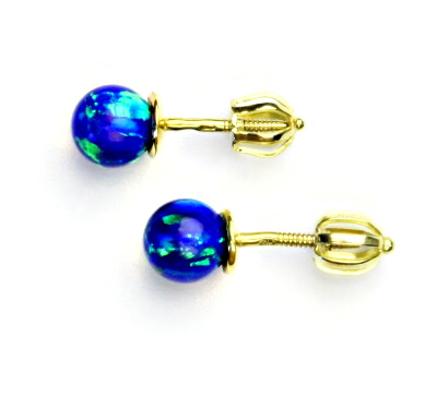 Náušnice ze žlutého zlata jsou zdobeny tmavě modrým syntetickým opálem ve tvaru kuličky o průměru 6 mm. Materiál je zlato 585/1000. Náušnice mají zapínání na šroubek. Orientační váha náušnic je 1,30 g.