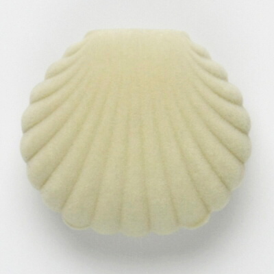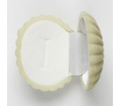 Elegantní sametová krabička na prsten ve tvaru mušle. Rozměr krabičky je 69x57x34 mm a barva je krémová.