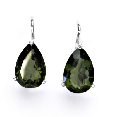 Náušnice z bílého zlata s přírodním vltavínem ve tvaru slzy. Rozměr vltavínu je 12x8 mm. Materiál je zlato 585/1000. Náušnice mají zapínání na klapku. Celková výška náušnice je 19 mm. Orientančí váha náušnic je 3,35 g.