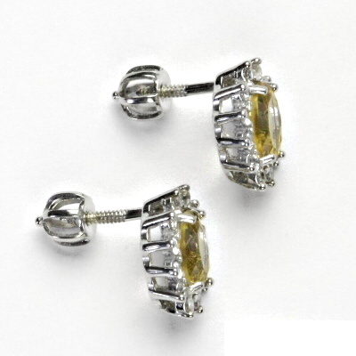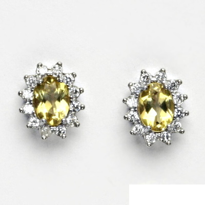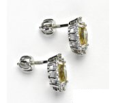 Náušnice z bílého zlata jsou zdobeny malými čirými zirkony a přírodním citrínem 7x5 mm. Materiál je zlato 585/1000. Rozměr náušnice je 11x10 mm. Náušnice mají zapínání na šroubek. Orientační váha náušnic je 3,1 g.