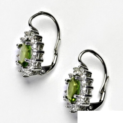 Náušnice z bílého zlata jsou zdobeny čirými zirkony a přírodním olivínem o rozměru 8x6 mm. Materiál náušnic je zlato 585/1000. Celková rozměr náušnice na výšku je 20 mm a 11,5 mm na šířku. Orientační váha náušnic je 3,9 g.