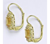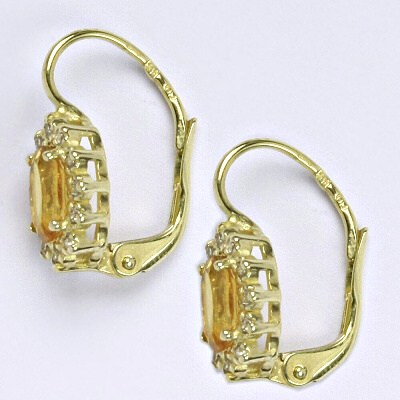 Zlaté náušnice ze žlutého zlata s přírodním kamenem citrín. Velikost kamene je 7 x 5 mm. Náušnice mají zapínání na klapku. Celková výška náušnice je 18 mm. Materiál je zlato 14 karátů 585/1000. Orientační váha je 3,4 g.