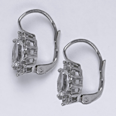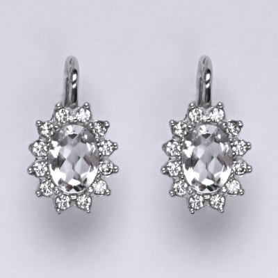 Zlaté náušnice s přírodním křišťálem a malými čirými zirkony. Velikost křišťálu je 7x5 mm. Materiál je bílé zlato 585/1000. Celková výška náušnice je 18 mm. Zapínání náušnic je na patent. Orientační váha náušnice 3,40 g..