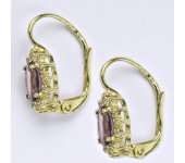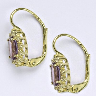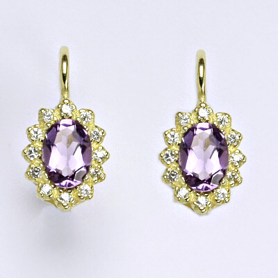 Zlaté náušnice ze žlutého zlata s přírodním kamenem ametyst. Velikost kamene je 7 x 5 mm. Náušnice mají zapínání na klapku. Celková výška náušnice je 18 mm. Materiál je zlato 14 karátů 585/1000. Orientační váha je 3,4 g.