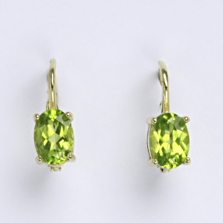 Zlaté náušnice ze žlutého zlata 14 karátů s přírodním olivínem. Velikost kamene je 7 x 5 mm. Náušnice mají zapínání na klasický patent. Celková výška náušnic je 15 mm. Orientační váha náušnic je 2,01 g.