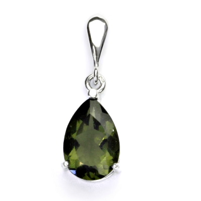 Přívěsek z bílého zlata s přírodním vltavínem ve tvaru slzy. Rozměr vltavínu je 12x8 mm. Materiál je zlato 585/1000. Orientační váha přívěsku je 1,7 g. Rozměr přívěsku je 24 mm včetně úchytu na výšku a 8 mm na šířku.