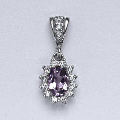 Zlatý přívěšek s přírodním ametystem a malými čirými zirkony. Velikost ametyst je 7x5 mm. Materiál je bílé zlato 585/1000. Celková výška přívěšku je 22 mm. Orientační váha přívěsku je 1,85 g.