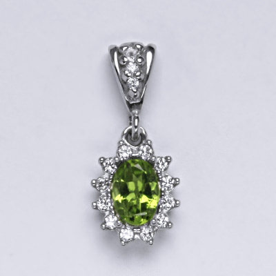 Zlatý přívěšek s přírodním olivínem a malými čirými zirkony. Velikost záhnědy je 7x5 mm. Materiál je bílé zlato 585/1000. Celková výška přívěšku je 22 mm. Orientační váha přívěsku je 1,85 g.