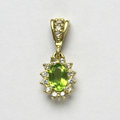 Přívěsek je vyroben ze žlutého zlata. Je zdoben přírodním olivínem o rozměru 7x5 mm a malými čirými zirkony. Celková výška přívěsku je 22 mm. Materiál je zlato 585/1000. Orientační váha přívěsku je 1,85 g