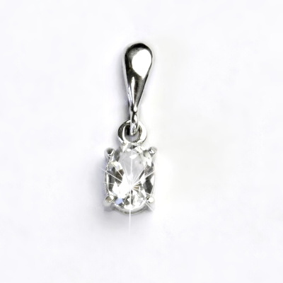 Zlatý přívěše z bílého zlata s přírodním křišťálem. Velikost kamene je 7 x 5 mm. Celková výška přívěšku je 19 mm. Orientační váha náušnic je 0,97 g.