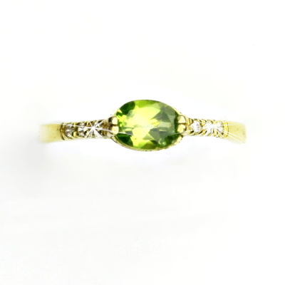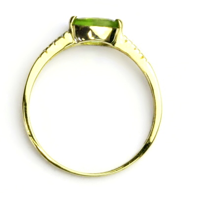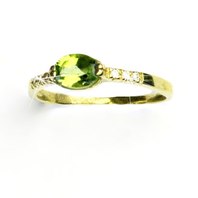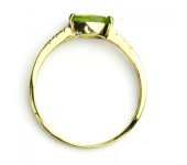 Zlatý prsten s čirými zirkony o průměru 1,30 mm a přírodním světlým olivínem o rozměru 7x5 mm. Materiál je zlato 585/1000. Orientační váha prstenu ve velikosti 54 je 1,92 g. Průměr zirkonů je 1,4 mm.