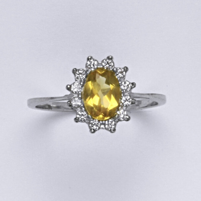 Zlatý prsten s přírodním citrínem a malými čirými zirkony. Velikost citrínu je 7x5 mm. Materiál je bílé zlato 585/1000. Orientační váha prstenu ve velikosti 54 je 2,37 g.