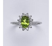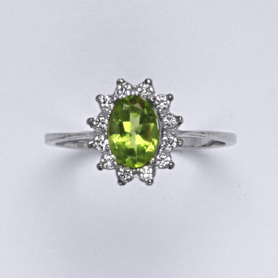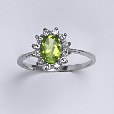 Zlatý prsten s přírodním olivínem a malými čirými zirkony. Velikost olivínu je 7x5 mm. Materiál je bílé zlato 585/1000. Orientační váha prstenu ve velikosti 54 je 2,37 g.