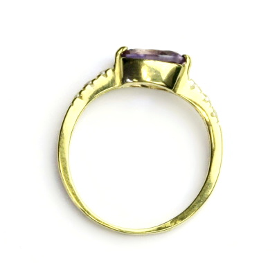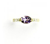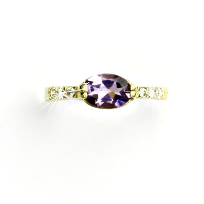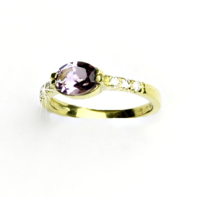 Zlatý prsten s čirými zirkony o průměru 1,30 mm a přírodním světlým ametystem o rozměru 7x5 mm. Materiál je zlato 585/1000. Orientační váha prstenu ve velikosti 54 je 1,92 g. Průměr zirkonů je 1,4 mm.