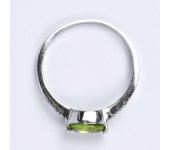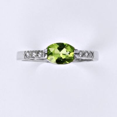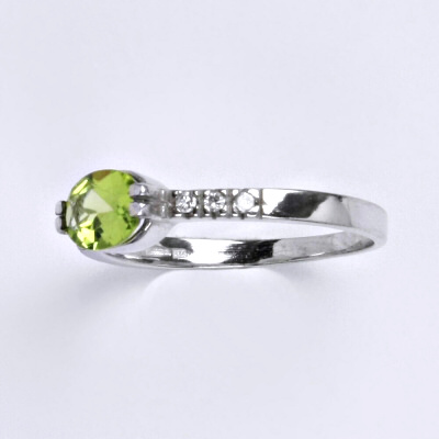 Zlatý prtsten z bílého zlata 14 karátů 585/1000 s přírodním olivínem. Velikost kamene je 7 x 5 mm. Orientační váha je 2,20 g.