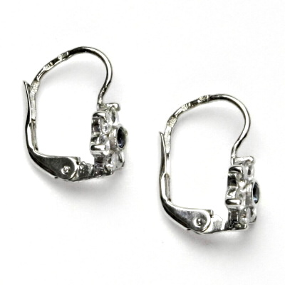 Dámské náušnice z bílého zlata mají tvar kytičky a jsou zdobeny čirými zirkony a jedním zirkonem v barvě akvamarinu. Rozměr kytičky je 8 mm. Náušnice mají zapínání na klapku a jsou rhodiované. Materiál je zlato 585/1000.