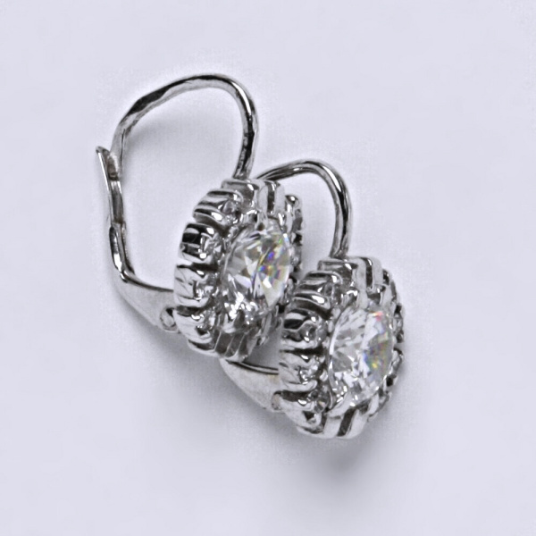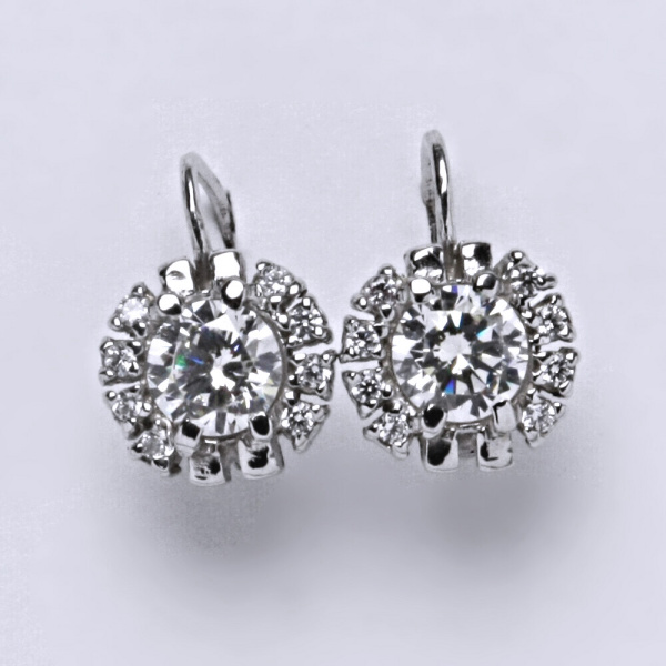 Zlaté náušnice ryzosti 585/1000. Použité čiré zirkony 6,5 mm a 1,5 mm. Celková velikost na výšku 17mm, orientační váha cca 4,9g.