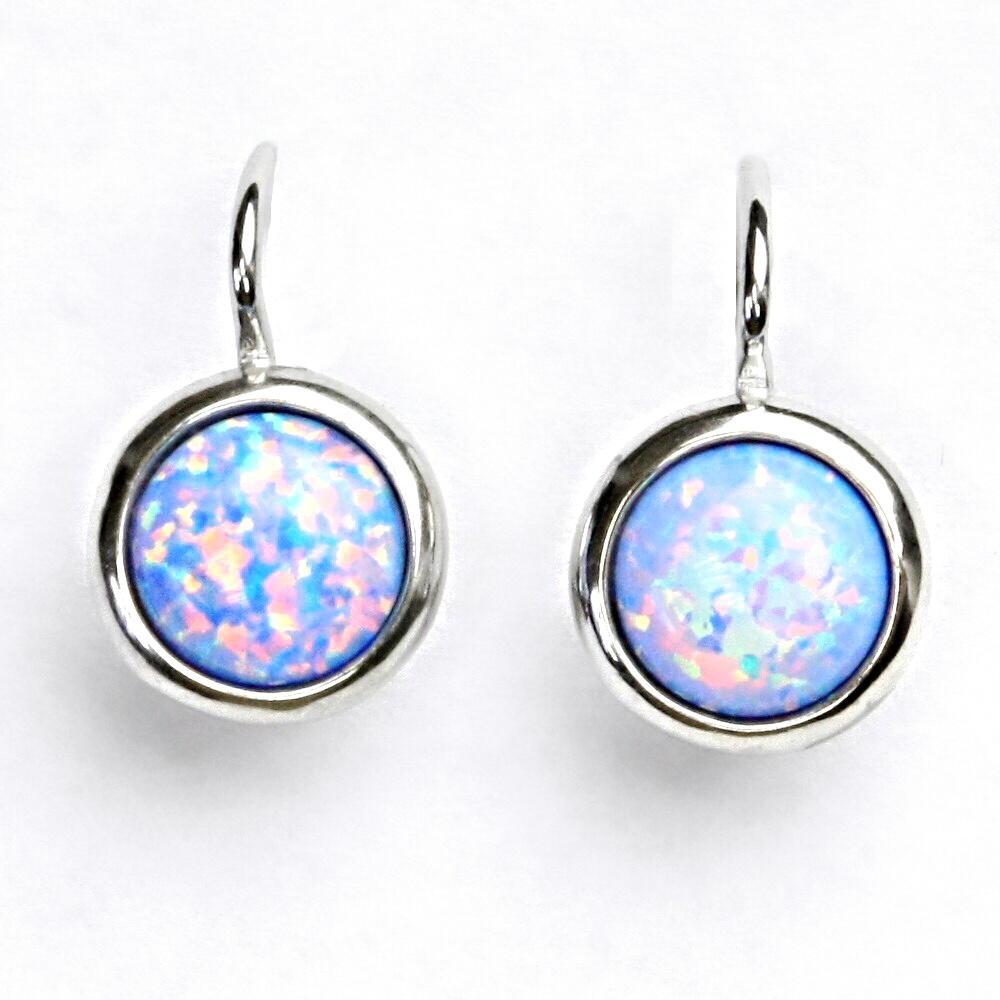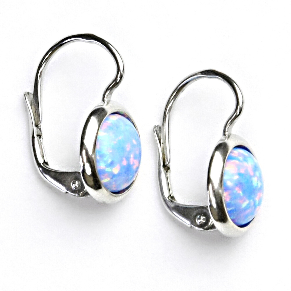 Náušnice z bílého zlata jsou zdobeny světle modrým syntetickým opálem o průměru 8 mm. Materiál je zlato 585/1000. Orientační váha náušnic je 2,96 g. Celková výška náušnice je 18 mm.
