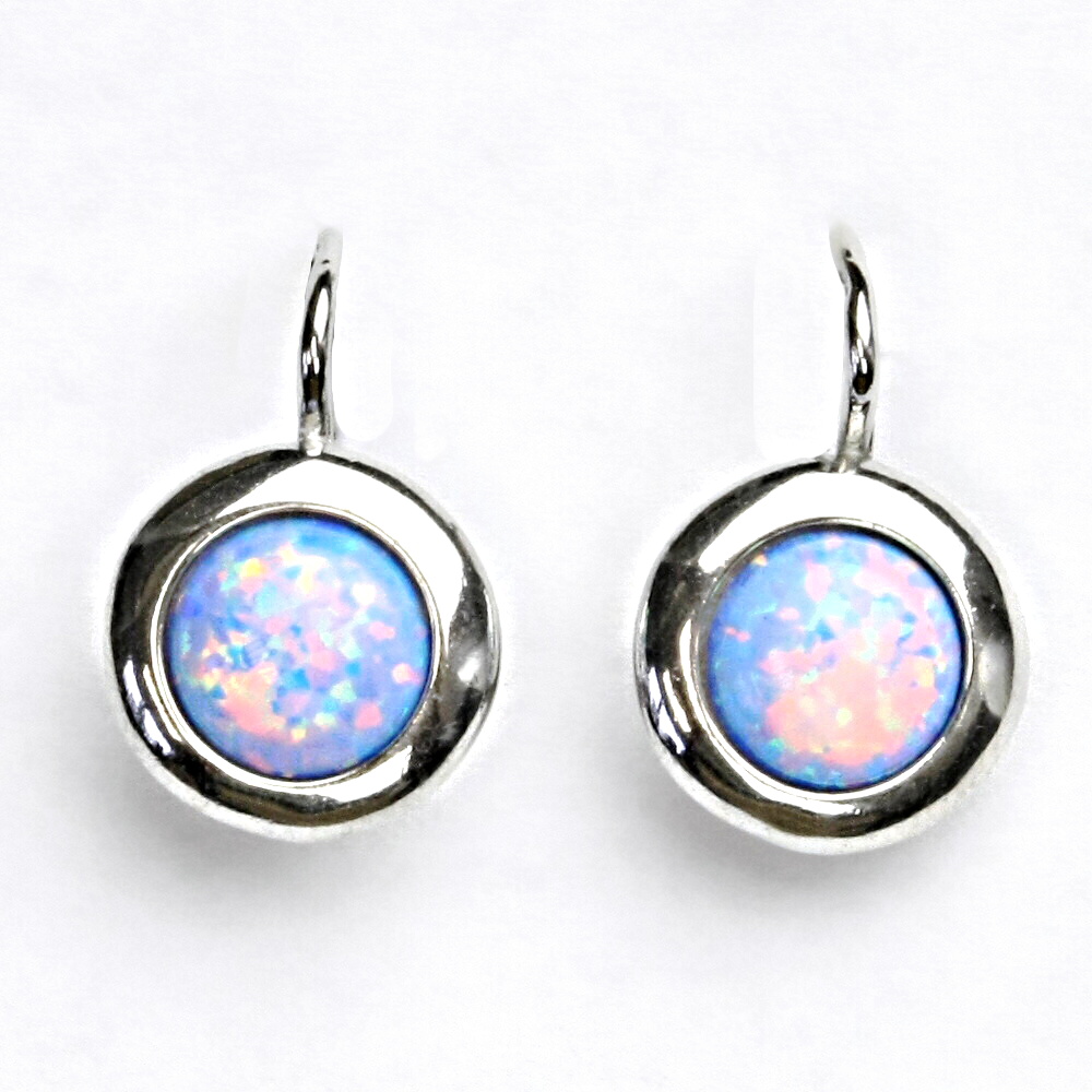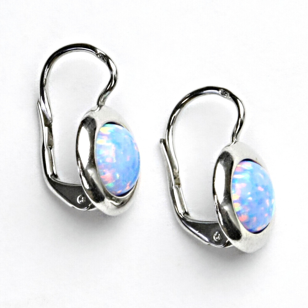 Náušnice z bílého zlata jsou zdobeny světle modrým syntetickým opálem o průměru 7 mm. Materiál je zlato 585/1000. Orientační váha náušnic je 2,78 g. Celková výška náušnice je 17 mm.