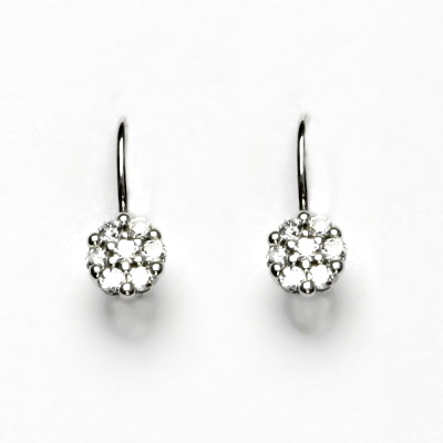 Dámské náušnice z bílého zlata mají tvar kytičky a jsou zdobeny čirými zirkony. Rozměr kytičky je 6x6 mm. Materiál je zlato 585/1000. Náušnice mají zapínání na klapku a jsou rhodiované. Celková výška náušnice je 15 mm. Orientační váha náušnic je 1,57 g