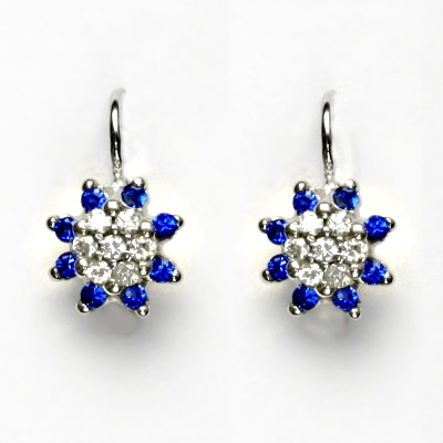 Dámské náušnice z bílého zlata mají tvar kytičky a jsou zdobeny čirými zirkony a zirkony v barvě spinelu. Rozměr kytičky je 10 mm. Materiál je zlato 585/1000. Náušnice mají zapínání na klapku a jsou rhodiované. Celková výška náušnice je 16 mm.