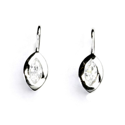 Náušnice z bílého zlata jsou zdobeny čirými zirkony. Materiál je zlato 585/1000. Orientační váha náušnic je 1,7 g. Náušnice mají zapínání na klapku. Celková výška náušnice je 16 mm. Rozměr zdobné části náušnice je 9x6 mm.