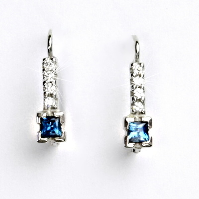 Náušnice z bílého zlata jsou zdobeny čirými zirkony a zirkonem v barvě akvamarinu. Orientační váha náušnic je 2,07 g. Materiál je zlato 585/1000. Náušnice mají zapínání na klapku. Celková výška náušnice je 18 mm.