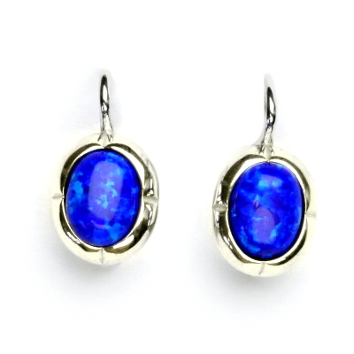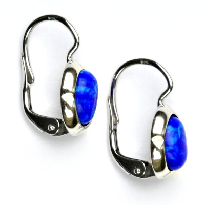 Náušnice z bílého zlata jsou zdobeny tmavě modrým syntetickým opálem o rozměru 8x6 mm. Materiál je zlato 585/1000. Orientační váha náušnice je 3,04 g. Celková výška náušnice je 16 mm.