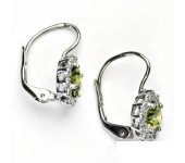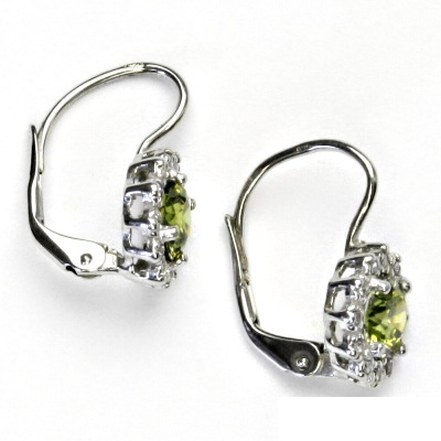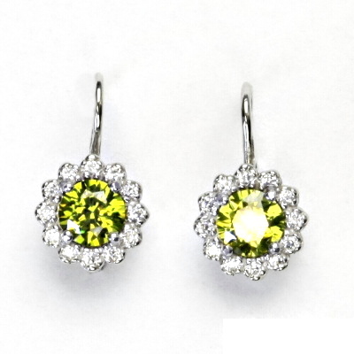 Dámské náušnice z bílého zlata jsou zdobeny malými čirými zirkony a zirkonem v barvě olivínu o průměru 6 mm. Materiál je zlato 585/1000. Náušnice mají zapínání na patent a jsou rhodiované. Orientační váha náušnic je 2,76 g.