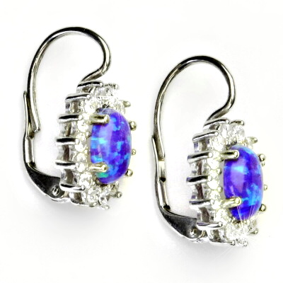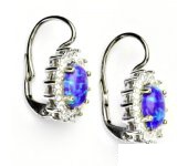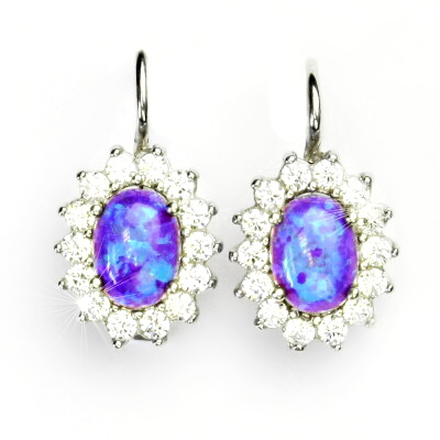 Náušnice z bílého zlata jsou zdobeny čirými zirkony a fialovým syntetickým opálem o rozměru 8x6 mm. Materiál náušnic je zlato 585/1000. Celková rozměr náušnice na výšku je 20 mm a 11,5 mm na šířku. Orientační váha náušnic je 3,9 g.