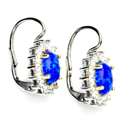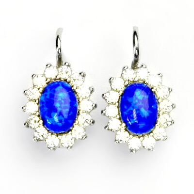 Náušnice z bílého zlata jsou zdobeny čirými zirkony a tmavě modrým syntetickým opálem o rozměru 8x6 mm. Materiál náušnic je zlato 585/1000. Celková rozměr náušnice na výšku je 20 mm a 11,5 mm na šířku. Orientační váha náušnic je 3,9 g.