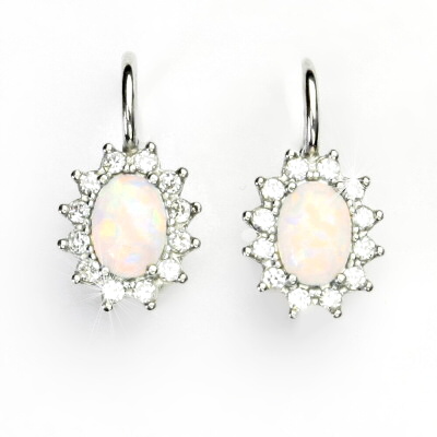 Náušnice z bílého zlata jsou zdobeny bílým syntetickým opálem o rozměru 7x5 mm a malými čirými zirkony. Celková výška náušnice je 18 mm. Materiál je zlato 585/1000. Orientační váha náušnice 3,37 g.